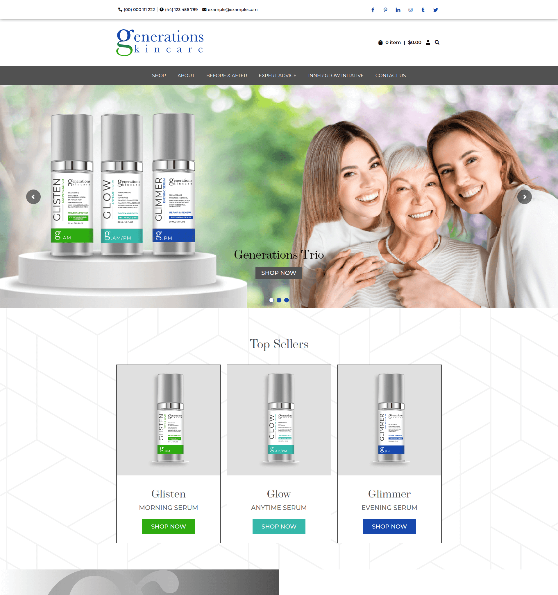 Theme for "Generations Skincare" site built using WordPress with Elementor Builder.